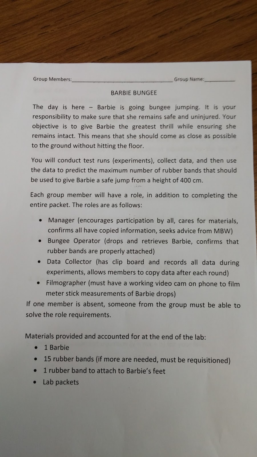 Today is the last day for which class time was given to complete data collection, graphs, and predictions prior to the FINAL TEST on Monday. On Monday, student groups will agree on the number of rubber bands to attach to their Barbie and drop her from a height of 400 cm. The target is to have their Barbie come as close to the ground as possible WITHOUT hitting the ground.